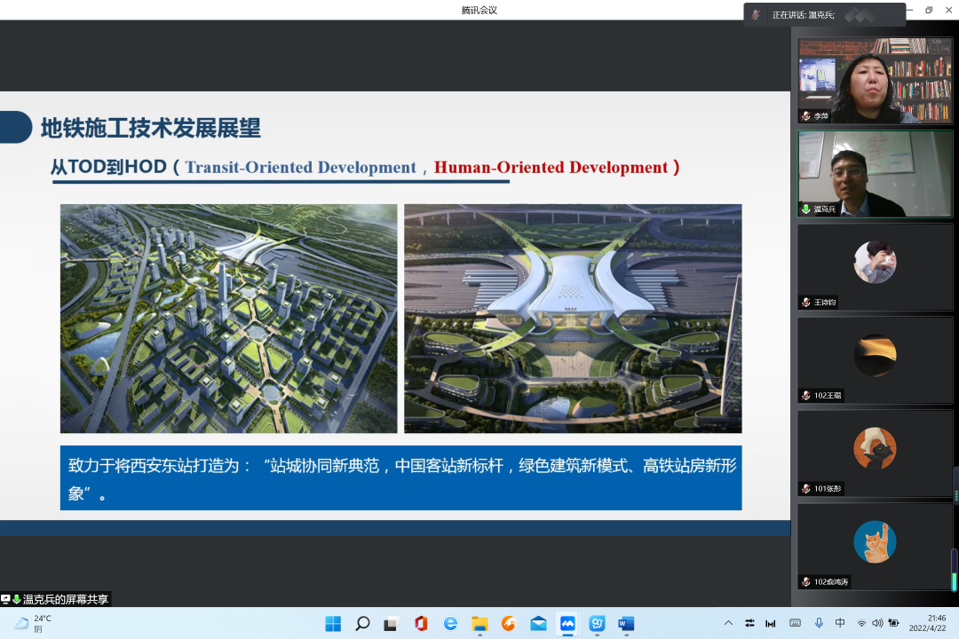 2022年4月22日晚上19:30-22:00,借助腾讯会议平台,地质工程系邀请西安市轨道交通集团建设公司副总经理温克兵作题为“城市轨道交通建设技术交流”的线上报告,作为抗击疫情系列活动的一个主要内容。讲座由地质工程系李萍主任主持,吸引了70余名师生参加。